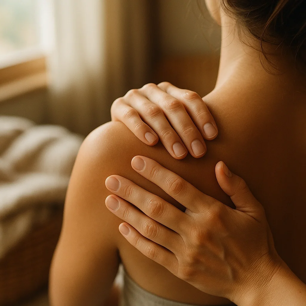 The jaw, shoulders, neck, and hips are “storage units” for stress and unresolved trauma. Gentle self-massage can help release what words can’t reach. You might use slow circles at your jaw hinge, or knead your shoulders, breathing into tension that arises. Similarly, abdominal massage in gentle circles can help release deeply-held psoas tension, bringing a feeling of safety and groundedness.
